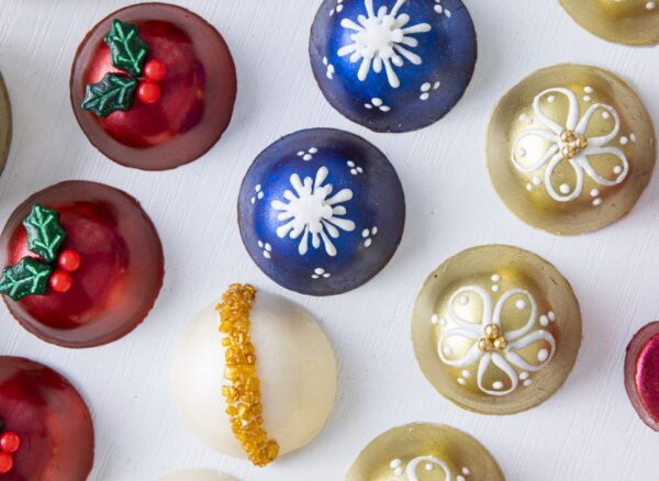 Bombones de chocolate blanco, negro o de leche rellenos de sabores como fresa, mora, frutos rojos, frutos amarillos, coco, crema de café, vainilla, nutella y arequipe. Son de 3cm de diámetro en forma de bombones de chocolate ¡Elige el sabor que prefieras!