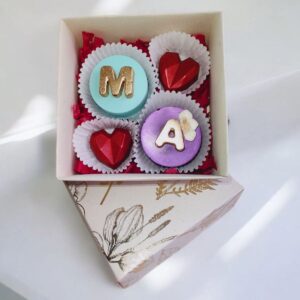 • Incluye 3 bombones de sabores surtidos de 3cm de diámetro en hermosa caja de 11*5cms