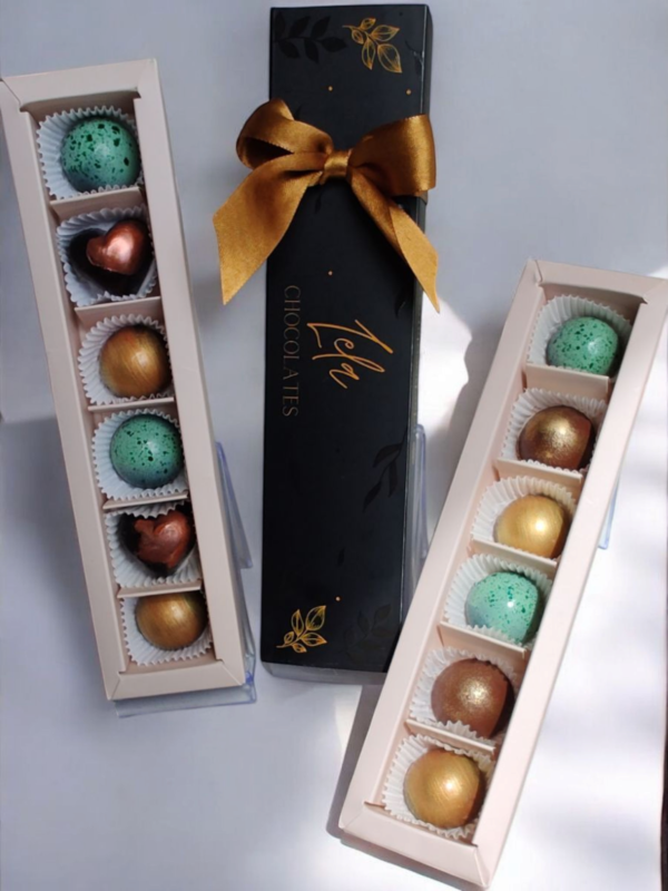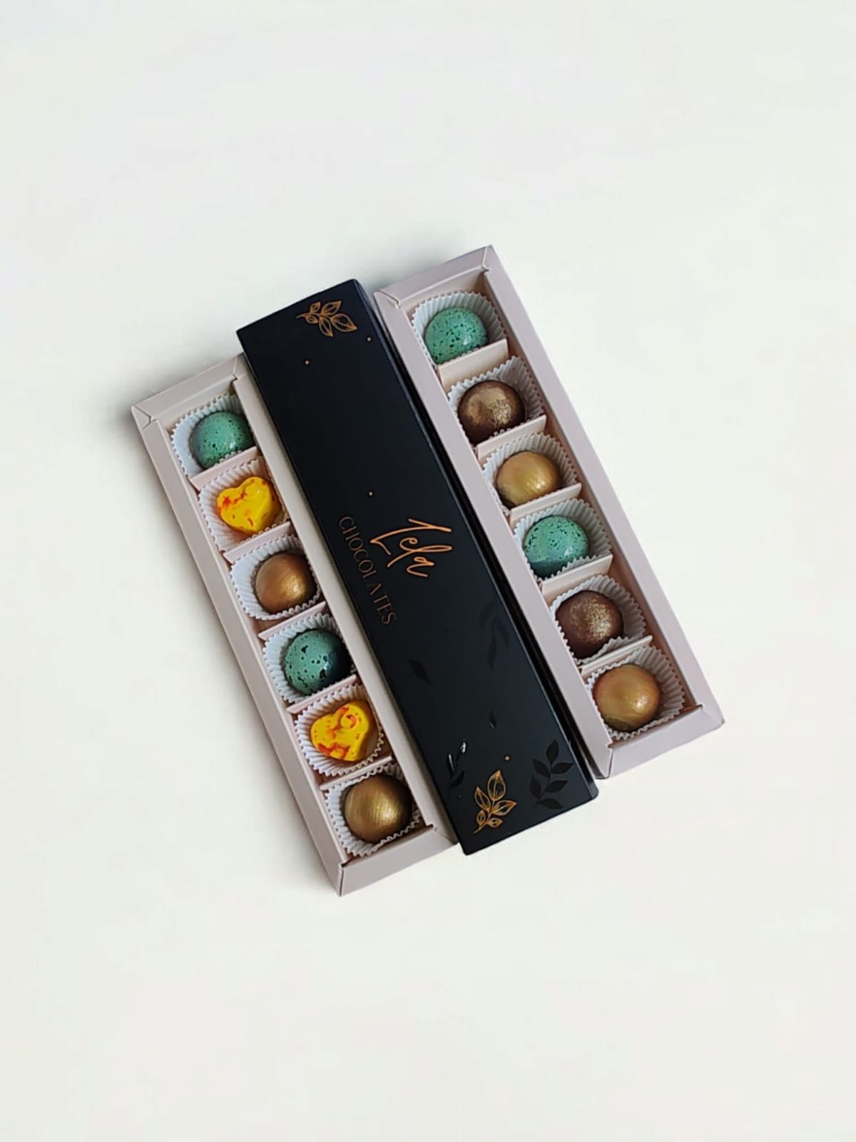 Delicada caja de chocolates rellenos elaborados con distintos tipos de chocolates selectos de origen colombiano, rellenos de distintos sabores frutales que destacan nuestra tradición colombiana como crema de café, pistacho, frutos amarillos, arequipe entre otros.