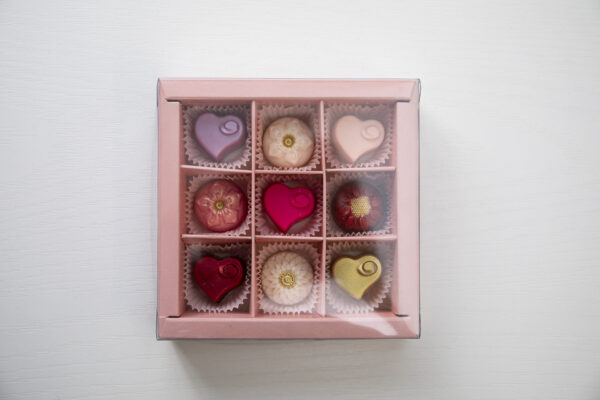 - Esta caja incluye 9 bombones de sabores surtidos de 3cm de diámetro.