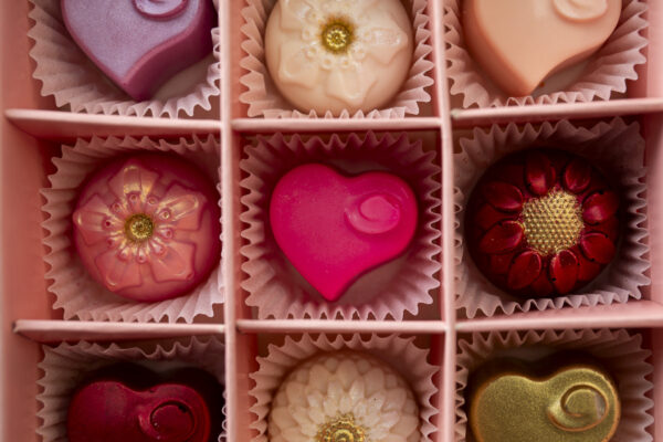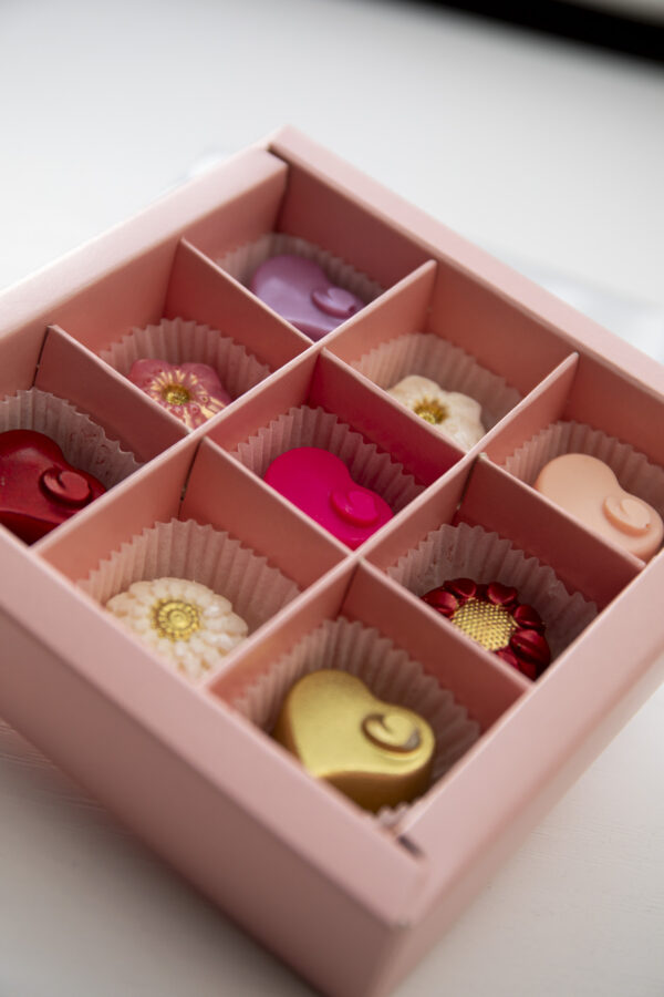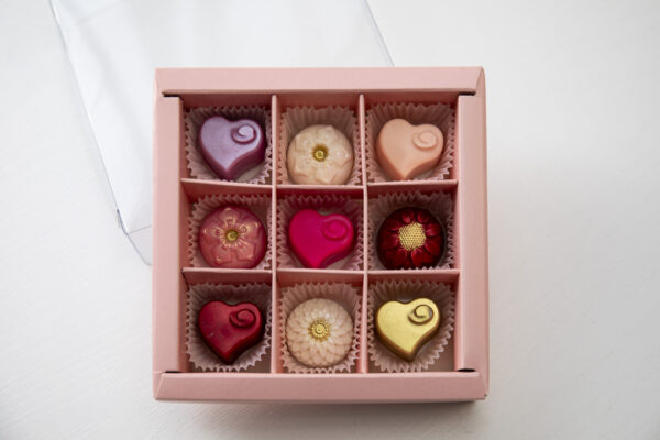 Delicada Caja de chocolates rellenos elaborados con distintos tipos de chocolates selectos de origen colombiano, rellenos de distintos sabores frutales que destacan nuestra tradicion colombiana como el coco, mora, fresa, arequipe, crema de café, piña, entre otros.