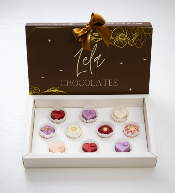 Delicada Caja de chocolates rellenos elaborados con distintos tipos de chocolates selectos de origen colombiano, rellenos de distintos sabores frutales que destacan nuestra tradicion colombiana como el coco, mora, fresa, arequipe, crema de café, piña, entre otros.